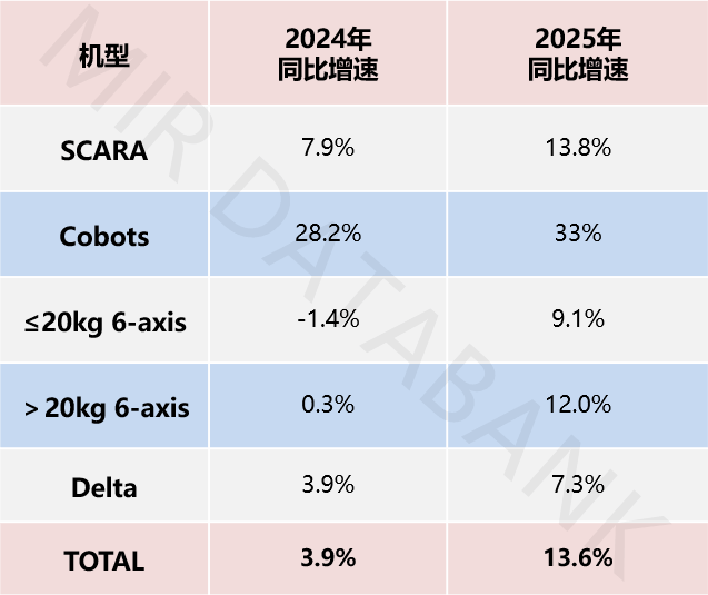 从各机型表示来看,2025年,除Delta、≤20kg 6-axis以外,其余机型均实现两位数增加,此中Cobots增速超30%。